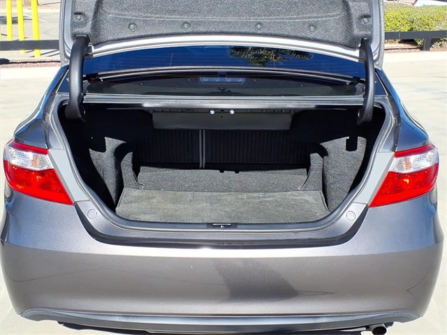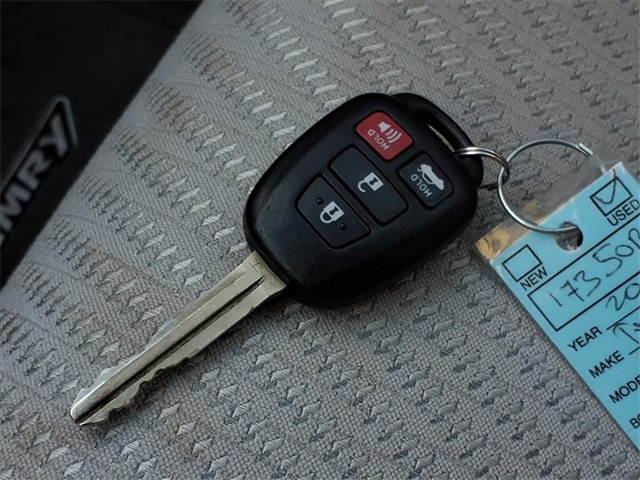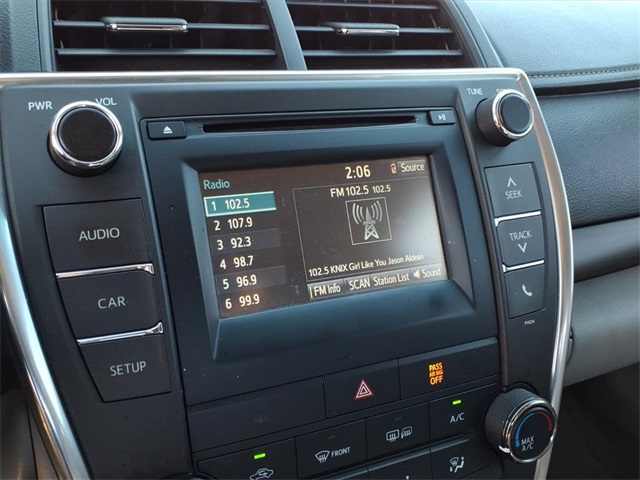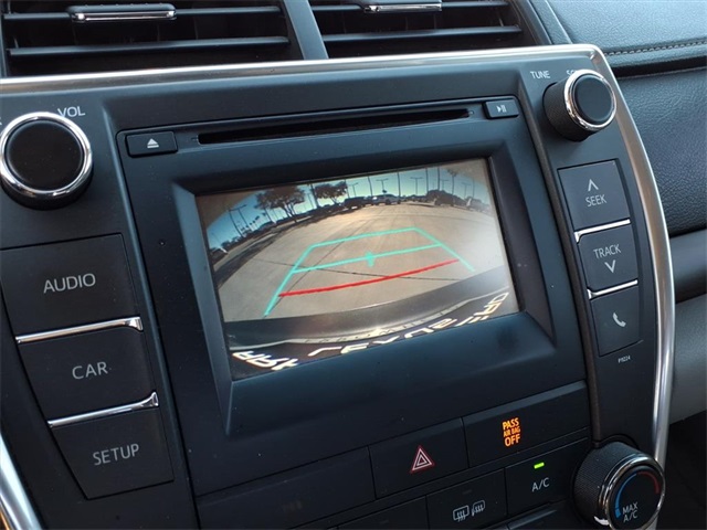 This Toyota Camry is equipped with the following features: Black w/Fabric Seat Trim, 4-Wheel Disc Brakes, 6 Speakers, ABS brakes, Air Conditioning, AM/FM radio, Brake assist, Bumpers: body-color, CD player, Delay-off headlights, Driver door bin, Driver vanity mirror, Dual front impact airbags, Dual front side impact airbags, Electronic Stability Control, Exterior Parking Camera Rear, Fabric Seat Trim, Four wheel independent suspension, Front anti-roll bar, Front Bucket Seats, Front Center Armrest, Front reading lights, Fully automatic headlights, Heated door mirrors, Illuminated entry, Knee airbag, Low tire pressure warning, Occupant sensing airbag, Outside temperature display, Overhead airbag, Overhead console, Panic alarm, Passenger door bin, Passenger vanity mirror, Power door mirrors, Power driver seat, Power steering, Power windows, Radio: Entune Audio, Rear anti-roll bar, Rear seat center armrest, Rear side impact airbag, Rear window defroster, Remote keyless entry, Speed control, Speed-sensing steering, Split folding rear seat, Steering wheel mounted audio controls, Tachometer, Telescoping steering wheel, Tilt steering wheel, Traction control, Trip computer, Variably intermittent wipers, and Wheels: 7.0J x 16" Steel.