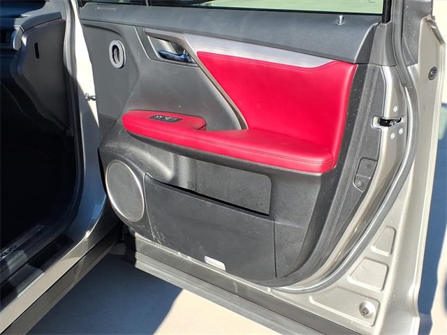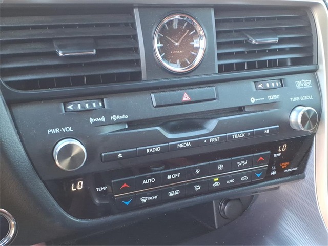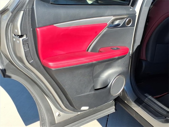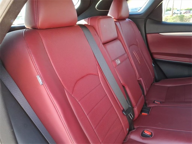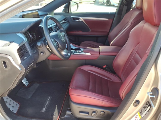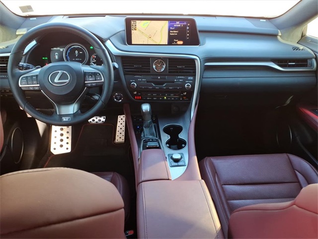 This Lexus RX is equipped with the following features: F Sport Package (F Sport Heated Leather Steering Wheel and Illuminated Aluminum Door Trim), 3.5L V6 DOHC VVT-i 24V, AWD, Rioja Red w/F Sport Leather, 12 Speakers, 12.3" Navigation System w/Mark Levinson Audio, 3.54 Axle Ratio, 4-Wheel Disc Brakes, ABS brakes, Adaptive suspension, Air Conditioning, Alloy wheels, AM/FM radio: SiriusXM, Anti-whiplash front head restraints, Auto High-beam Headlights, Auto tilt-away steering wheel, Auto-dimming door mirrors, Auto-dimming Rear-View mirror, Automatic temperature control, Brake assist, Bumpers: body-color, CD player, Delay-off headlights, Driver door bin, Driver vanity mirror, Dual front impact airbags, Dual front side impact airbags, DVD-Audio, Electronic Stability Control, Emergency communication system, Exterior Parking Camera Rear, F Sport Leather, F Sport Wheel Caps, Four wheel independent suspension, Front anti-roll bar, Front Bucket Seats, Front Center Armrest, Front dual zone A/C, Front fog lights, Front Heated/Ventilated Bucket Seats, Front reading lights, Fully automatic headlights, Garage door transmitter: HomeLink, Heated door mirrors, Heated front seats, Heated steering wheel, Illuminated entry, Knee airbag, Leather Shift Knob, Leather steering wheel, Low tire pressure warning, Memory seat, Navigation System, Occupant sensing airbag, Outside temperature display, Overhead airbag, Overhead console, Panic alarm, Panoramic Moonroof, Passenger door bin, Passenger vanity mirror, Power door mirrors, Power driver seat, Power Liftgate, Power moonroof, Power passenger seat, Power steering, Power windows, Radio data system, Radio: AM/FM/HD w/Single In-Dash CD, Rain sensing wipers, Rear anti-roll bar, Rear reading lights, Rear seat center armrest, Rear side impact airbag, Rear window defroster, Rear window wiper, Remote keyless entry, Roof rack: rails only, Security system, Speed control, Speed-sensing steering, Split folding rear seat, Spoiler, Steering wheel memory, Steering wheel mounted audio controls, Tachometer, Telescoping steering wheel, Tilt steering wheel, Traction control, Trip computer, Turn signal indicator mirrors, Variably intermittent wipers, Ventilated front seats, and Wheels: 20" x 7.5" Dk Metallic Super Chrome Finish.