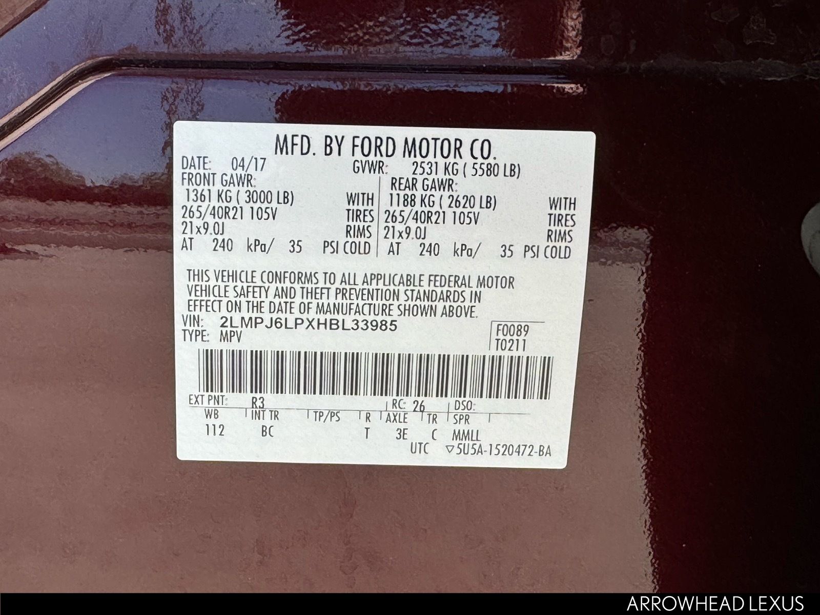- VIN : 2LMPJ6LPXHBL33985