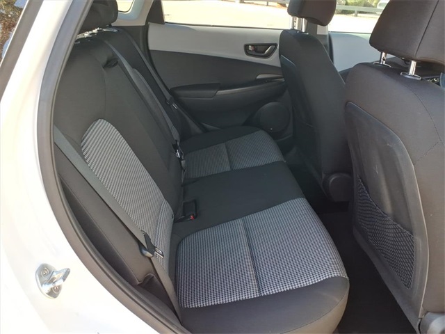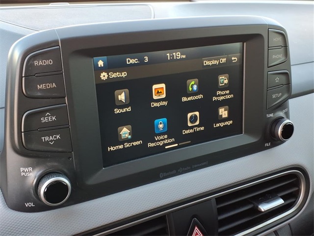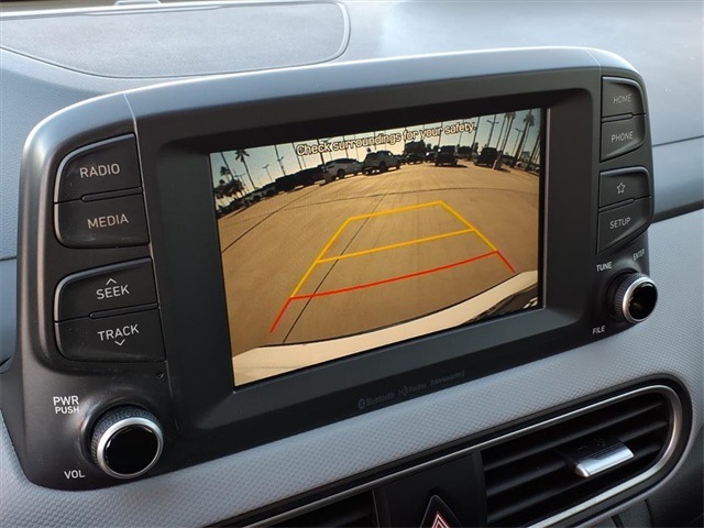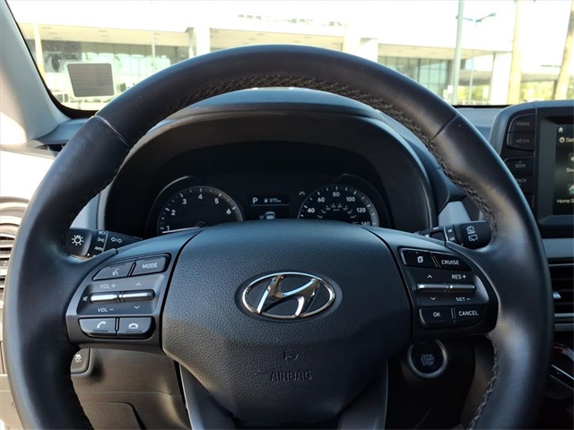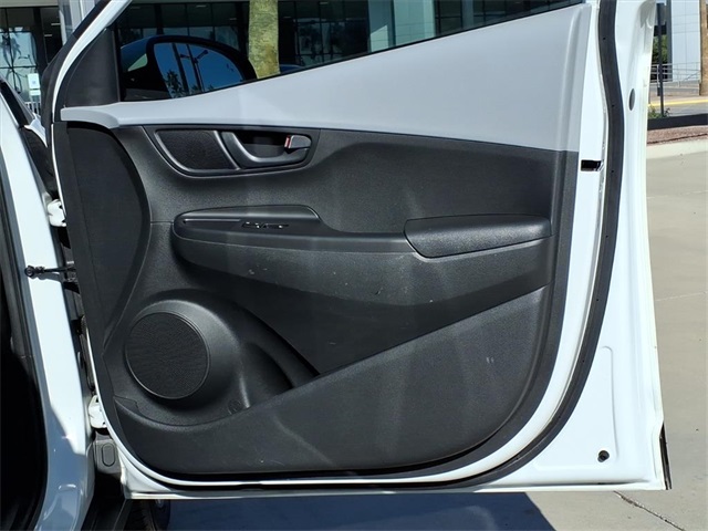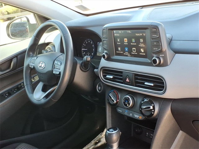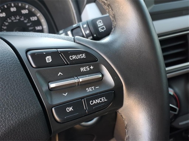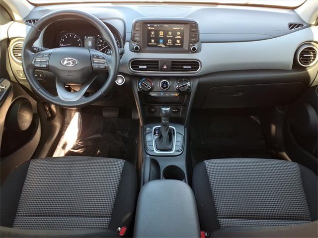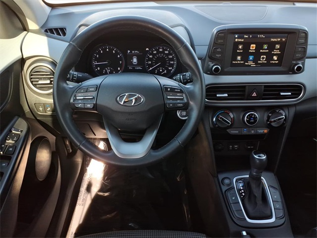 This Hyundai Kona is equipped with the following features: SEL Tech Package 02 (8-Way Power Driver Seat, Fog Lights, Option Group 02, Power Tilt & Slide Sunroof w/Sunshade, and Shark Fin Antenna), 17" Alloy Wheels, 3.510 Axle Ratio, 4-Wheel Disc Brakes, 6 Speakers, ABS brakes, Air Conditioning, Alloy wheels, AM/FM radio: SiriusXM, Apple CarPlay & Android Auto, Brake assist, Bumpers: body-color, Cargo Net, Cargo Tray, Carpeted Floor Mats, Cloth Seat Trim, Delay-off headlights, Driver door bin, Driver vanity mirror, Dual front impact airbags, Dual front side impact airbags, Electronic Stability Control, Exterior Parking Camera Rear, Front anti-roll bar, Front Bucket Seats, Front Center Armrest, Front reading lights, Front wheel independent suspension, Fully automatic headlights, Heated door mirrors, Heated Front Bucket Seats, Heated front seats, Illuminated entry, Leather Shift Knob, Leather steering wheel, Low tire pressure warning, Occupant sensing airbag, Outside temperature display, Overhead airbag, Overhead console, Panic alarm, Passenger door bin, Passenger vanity mirror, Power door mirrors, Power steering, Power windows, Radio: AM/FM/HD Radio/SiriusXM Audio System, Rear Bumper Applique, Rear seat center armrest, Rear window defroster, Rear window wiper, Remote keyless entry, Roof rack: rails only, Security system, Speed control, Speed-sensing steering, Split folding rear seat, Spoiler, Steering wheel mounted audio controls, Tachometer, Telescoping steering wheel, Tilt steering wheel, Traction control, Trip computer, Turn signal indicator mirrors, and Variably intermittent wipers.