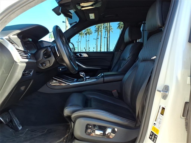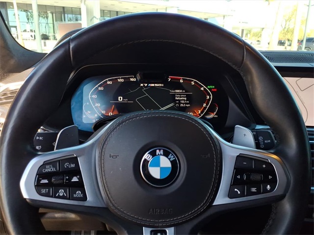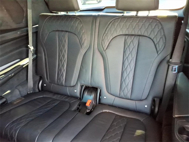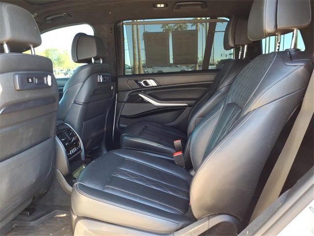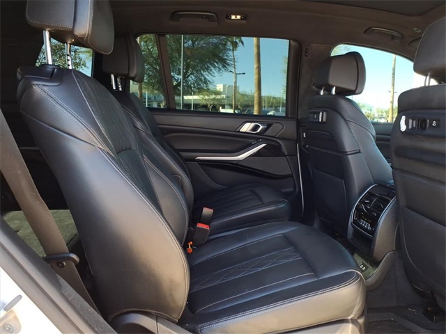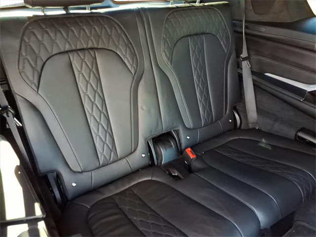 This BMW X7 is equipped with the following features: Executive Package (Glass Controls, Heated & Cooled Cup Holders, and Panoramic Sky Lounge LED Roof), Luxury Seating Package (Front Massaging Seats and Front Ventilated Seats), Cold Weather Package (5-Zone Automatic Climate Control and Front & Rear Heated Seats), Connected Package Pro, Driving Assistance Professional Package (Active Driving Assistant Pro and Extended Traffic Jam Assistant), 16 Speakers, 3.15 Axle Ratio, 3rd row seats: split-bench, 4-Wheel Disc Brakes, ABS brakes, Air Conditioning, Alloy wheels, AM/FM radio: SiriusXM with 360L, AM/FM Stereo, Apple CarPlay & Android Auto Compatibility, Apple CarPlay Compatibility, Auto High-beam Headlights, Auto tilt-away steering wheel, Auto-dimming door mirrors, Auto-dimming Rear-View mirror, Auto-leveling suspension, Automatic temperature control, BMW Assist eCall, BMW TeleServices, Brake assist, Bumpers: body-color, Compass, ConnectedDrive Services, Delay-off headlights, Door auto-latch, Drive Recorder, Driver door bin, Driver vanity mirror, Dual front impact airbags, Dual front side impact airbags, Electronic Stability Control, Emergency communication system: BMW Assist eCall, Extended Merino Leather Upholstery, Extended Shadowline Trim, Four wheel independent suspension, Front anti-roll bar, Front Bucket Seats, Front Center Armrest, Front dual zone A/C, Front fog lights, Front reading lights, Fully automatic headlights, Garage door transmitter, Genuine wood console insert, Genuine wood dashboard insert, Genuine wood door panel insert, Gesture Control, harman/kardon Surround Sound System, harman/kardon Speakers, Head restraints memory, Head-Up Display, Heads-Up Display, Heated door mirrors, Heated front seats, Heated Multi-Contour Seats, Heated steering wheel, Illuminated entry, Knee airbag, Leather Dashboard, Leather Shift Knob, Live Cockpit Pro w/Navi, Low tire pressure warning, Memory seat, Navigation System, Occupant sensing airbag, Outside temperature display, Overhead airbag, Panic alarm, Passenger door bin, Passenger vanity mirror, Power adjustable front head restraints, Power door mirrors, Power driver seat, Power Front Seats, Power moonroof, Power passenger seat, Power steering, Power windows, Radio data system, Rain sensing wipers, Rear air conditioning, Rear anti-roll bar, Rear dual zone A/C, Rear reading lights, Rear seat center armrest, Rear window defroster, Rear window wiper, Reclining 3rd row seat, Remote keyless entry, Roof rack: rails only, Second-Row Captain's Chairs, Security system, SiriusXM w/360L, Speed control, Speed-sensing steering, Speed-Sensitive Wipers, Split folding rear seat, Spoiler, Sport steering wheel, Steering wheel memory, Steering wheel mounted audio controls, Tachometer, Telescoping steering wheel, Tilt steering wheel, Traction control, Trailer Hitch, Trip computer, Turn signal indicator mirrors, Variably intermittent wipers, Vernasca Leather Upholstery, and Wheels: 22" x 9.5" Fr & 22" x 10.5" Rr M V-Spoke.