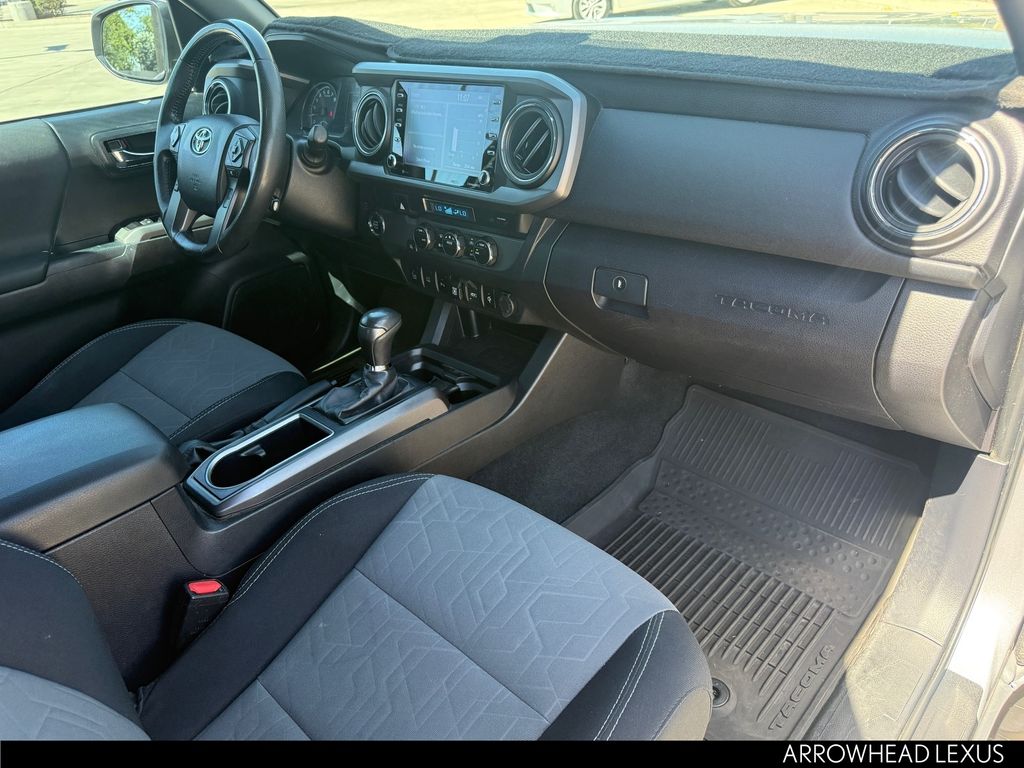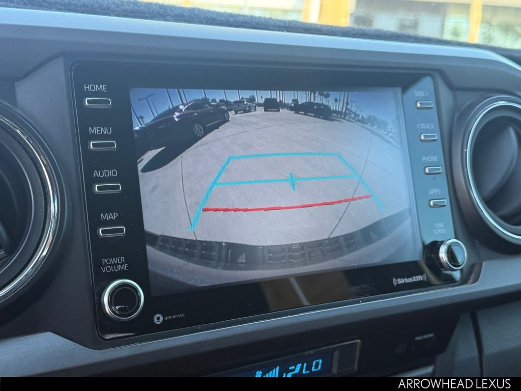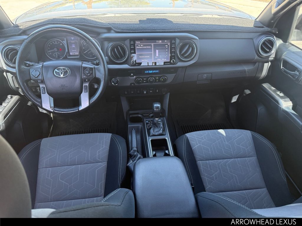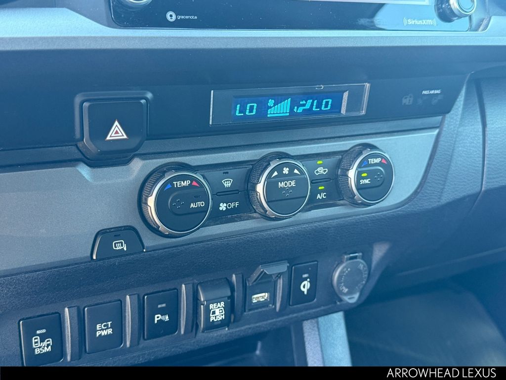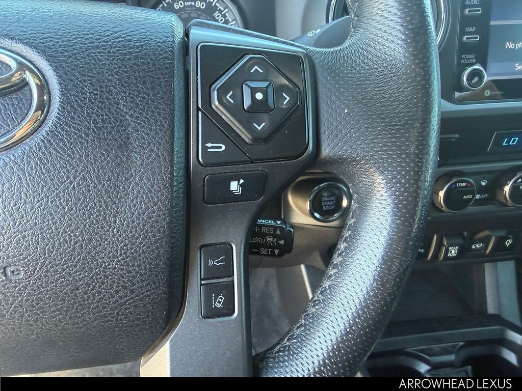 This Toyota Tacoma is equipped with the following features: ABS brakes, Active Cruise Control, Air Conditioning, Alloy wheels, Automatic temperature control, Electronic Stability Control, Front dual zone A/C, Heated door mirrors, Illuminated entry, Low tire pressure warning, Remote keyless entry, Traction control, 120V/400W Deck Mounted AC Power, 6 Speakers, AM/FM radio: SiriusXM, Anti-whiplash front head restraints, Apple CarPlay/Android Auto, Auto High-beam Headlights, Auto-dimming Rear-View mirror, Axle Ratio: 3.91, Black Overfenders, Brake assist, Bumpers: body-color, Driver door bin, Dual front impact airbags, Dual front side impact airbags, Emergency communication system: Safety Connect with 1-year trial, Engine Immobilizer, Exterior Parking Camera Rear, Fabric Seat Trim (FD), Front anti-roll bar, Front Bucket Seats, Front Center Armrest, Front fog lights, Front reading lights, Front Seats, Front wheel independent suspension, Knee airbag, Leather Shift Knob, Occupant sensing airbag, Outside temperature display, Overhead airbag, Overhead console, Panic alarm, Passenger door bin, Power door mirrors, Power driver seat, Power steering, Power windows, Radio: AM/FM Radio, Rear step bumper, Security system, Smart Key w/Push Button Start, Speed control, Speed-sensing steering, Split folding rear seat, Steering wheel mounted audio controls, Tachometer, Telescoping steering wheel, Tilt steering wheel, Trip computer, Turn signal indicator mirrors, Variably intermittent wipers, and Wheels: 16" x 7J Machined Contrast Alloy.