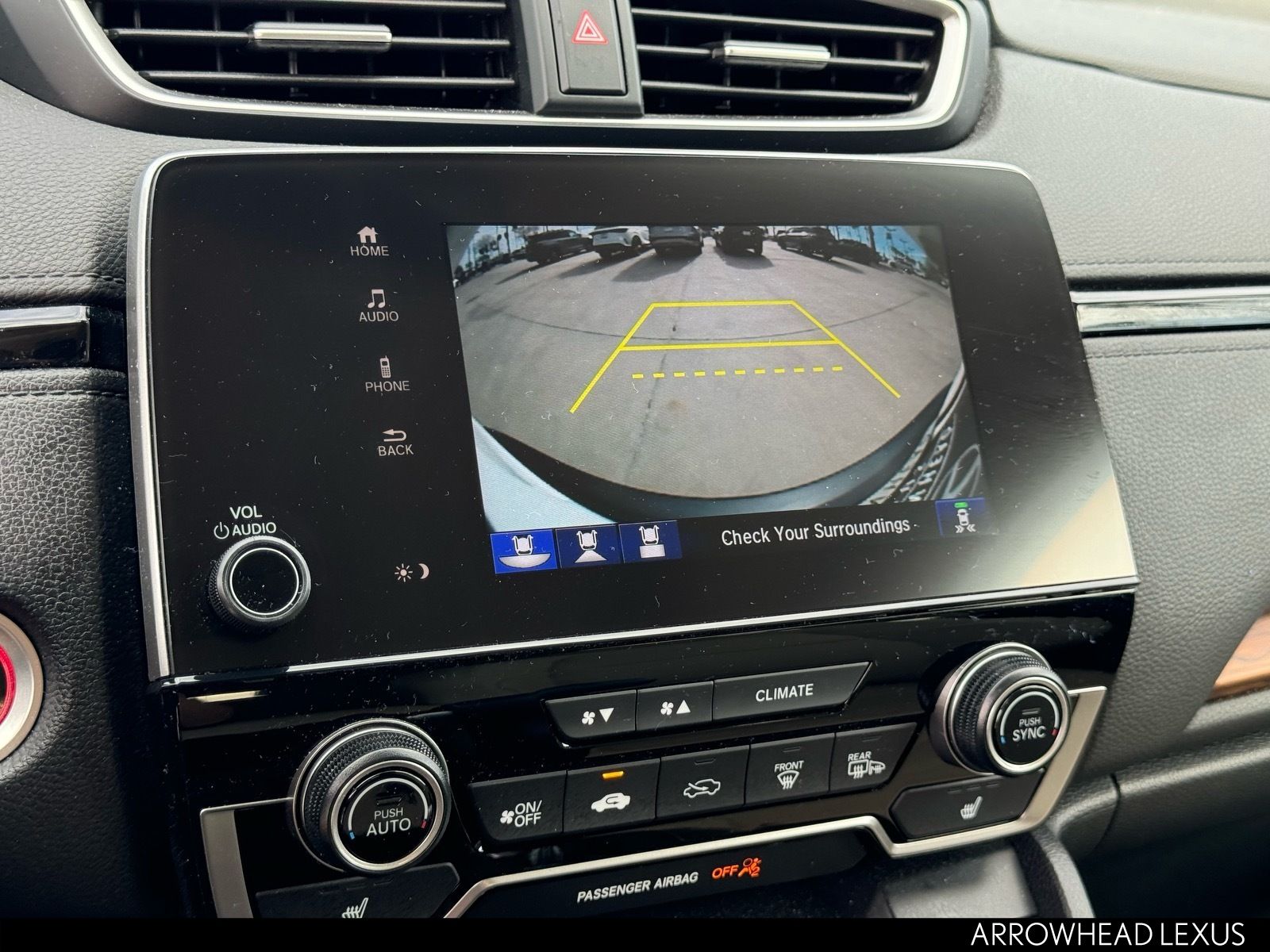 This Honda CR-V is equipped with the following features: 18" Alloy Wheels, 4-Wheel Disc Brakes, 5.64 Axle Ratio, 8 Speakers, ABS brakes, Adaptive Cruise Control: Adaptive Cruise Control (ACC) with Low-Speed Follow, Air Conditioning, Alloy wheels, AM/FM radio: SiriusXM, Apple CarPlay/Android Auto, Auto High-beam Headlights, Auto-dimming Rear-View mirror, Automatic temperature control, Blind Spot Information (BSI) System warning, Brake assist, Bumpers: body-color, Compass, Delay-off headlights, Driver door bin, Driver vanity mirror, Dual front impact airbags, Dual front side impact airbags, Electronic Stability Control, Exterior Parking Camera Rear, Forward collision: Collision Mitigation Braking System (CMBS) + FCW mitigation, Four wheel independent suspension, Front anti-roll bar, Front Bucket Seats, Front Center Armrest, Front dual zone A/C, Front fog lights, Front reading lights, Garage door transmitter: HomeLink, Heated door mirrors, Heated Front Bucket Seats, Heated front seats, Illuminated entry, Leather Seat Trim, Leather Shift Knob, Low tire pressure warning, Memory seat, Occupant sensing airbag, Outside temperature display, Overhead airbag, Overhead console, Panic alarm, Passenger door bin, Passenger vanity mirror, Power door mirrors, Power driver seat, Power Liftgate, Power moonroof, Power passenger seat, Power steering, Power windows, Radio data system, Radio: 180-Watt AM/FM/HD/SiriusXM Audio System, Rear anti-roll bar, Rear seat center armrest, Rear window defroster, Rear window wiper, Remote keyless entry, Security system, Speed control, Speed-sensing steering, Speed-Sensitive Wipers, Split folding rear seat, Spoiler, Steering wheel mounted audio controls, Tachometer, Telescoping steering wheel, Tilt steering wheel, Traction control, Trip computer, Turn signal indicator mirrors, and Variably intermittent wipers.