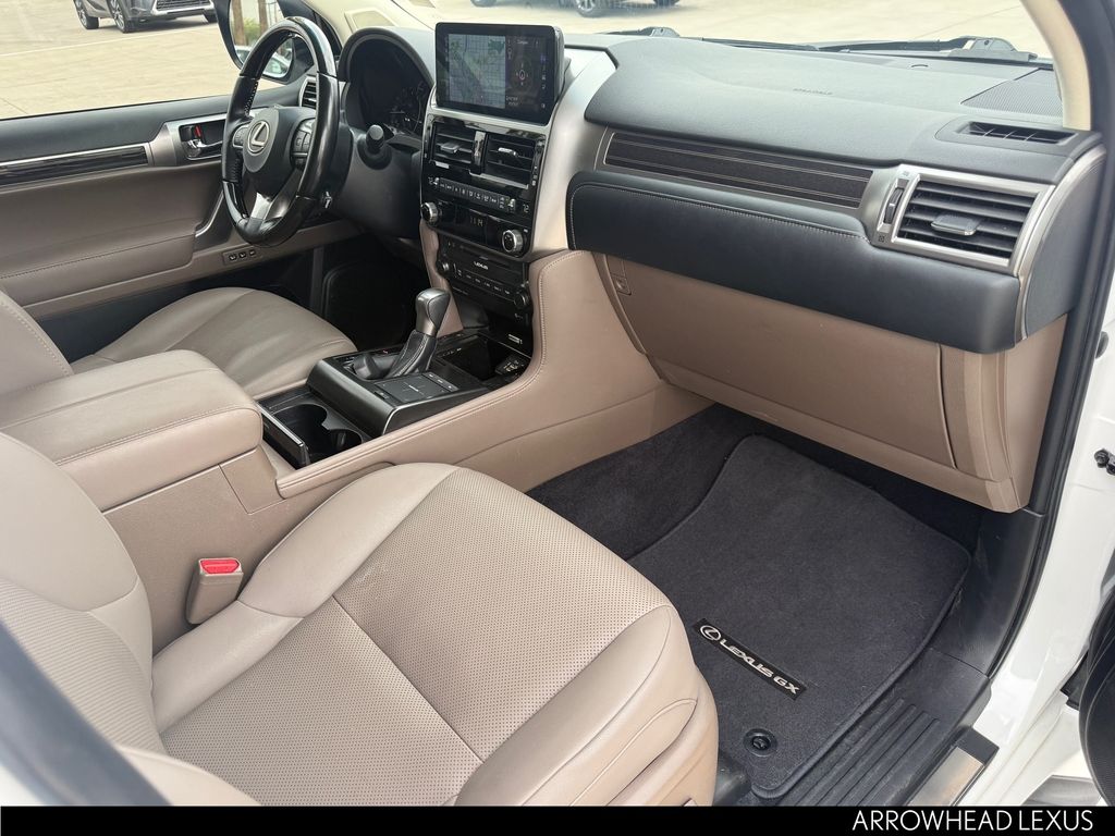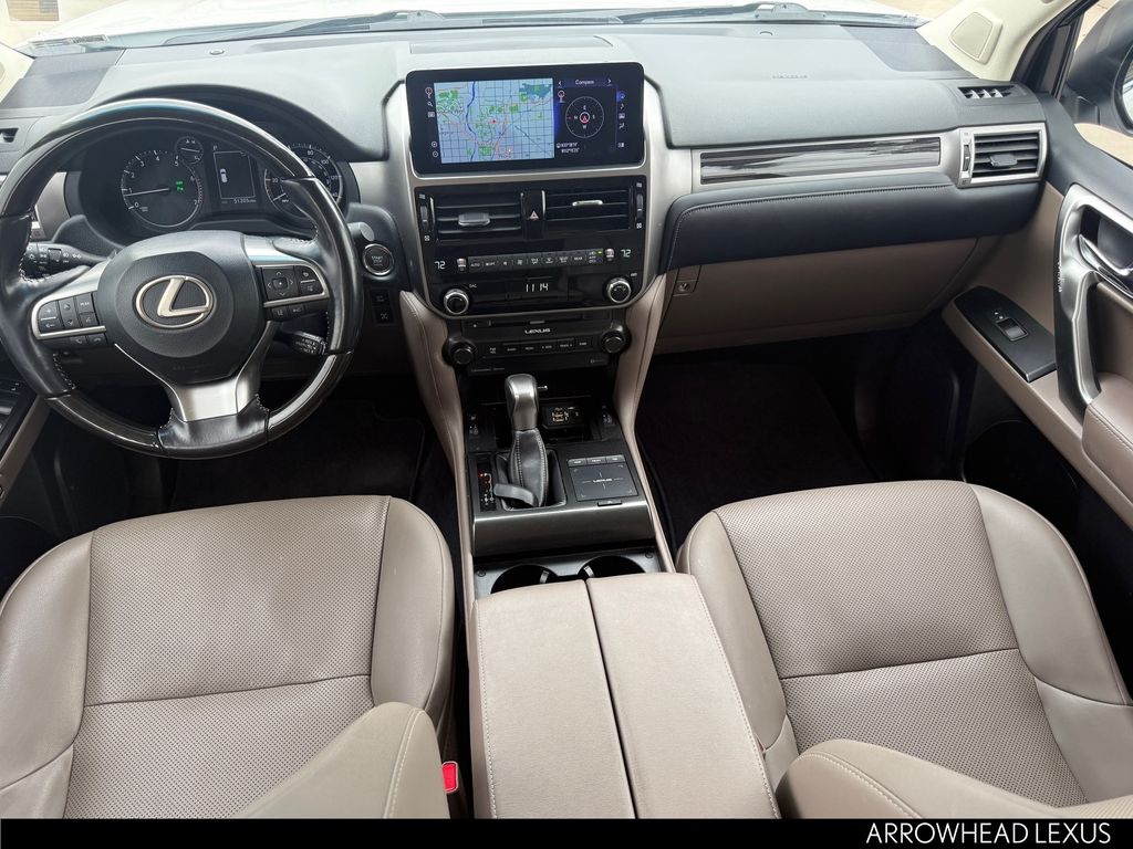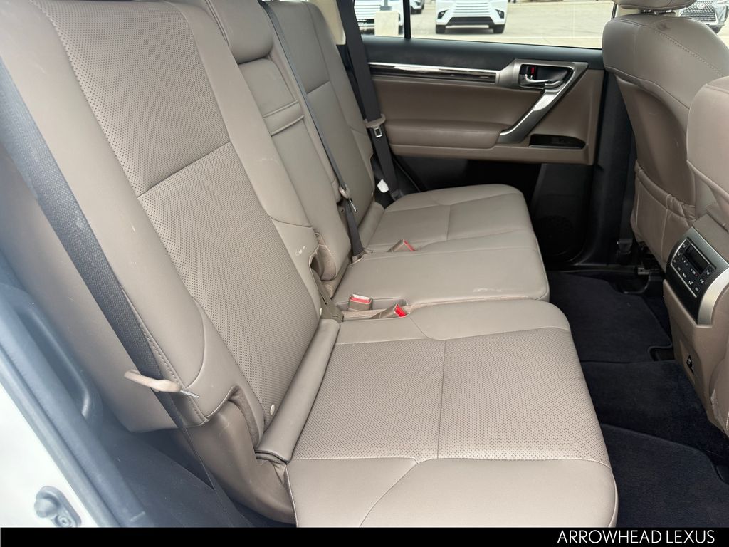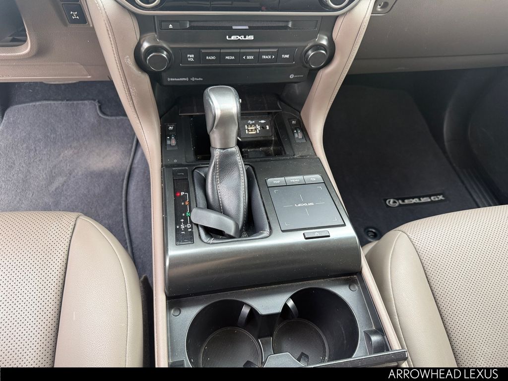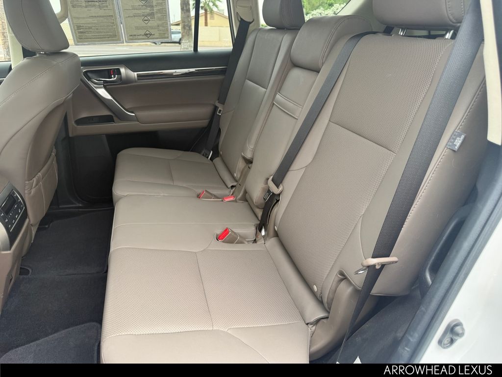 This Lexus GX is equipped with the following features: Premium Package (Dual Front & Rear Auto Air Conditioner, Front & Rear Heated Seats, LED Front Fog & Driving Lamp, NuLuxe Seat Trim, Ventilated Front Seats, Windshield De-Icer, and Windshield Wiper Control w/Rain Sensor), Lexus Certified Certified, 18" x 7.5J Aluminum Alloy Wheels, 3.909 Axle Ratio, 3rd row seats: split-bench, 4-Wheel Disc Brakes, 9 Speakers, ABS brakes, Air Conditioning, Alloy wheels, AM/FM radio: SiriusXM, Anti-whiplash front head restraints, Apple CarPlay/Android Auto, Auto High-beam Headlights, Auto tilt-away steering wheel, Auto-dimming Rear-View mirror, Automatic temperature control, Brake assist, Bumpers: body-color, CD player, Compass, Delay-off headlights, Driver door bin, Driver vanity mirror, Driver's Seat Mounted Armrest, Dual front impact airbags, Dual front side impact airbags, Electronic Stability Control, Emergency communication system, Exterior Parking Camera Rear, Front anti-roll bar, Front Bucket Seats, Front dual zone A/C, Front reading lights, Front wheel independent suspension, Fully automatic headlights, Garage door transmitter: HomeLink, Heated door mirrors, Illuminated entry, Illuminated running boards, Knee airbag, Leather Shift Knob, Leather steering wheel, Low tire pressure warning, Memory seat, Navigation System, NuLuxe Synthetic Leather Seat Trim, Occupant sensing airbag, Outside temperature display, Overhead airbag, Overhead console, Panic alarm, Passenger door bin, Passenger seat mounted armrest, Passenger vanity mirror, Power door mirrors, Power driver seat, Power moonroof, Power passenger seat, Power steering, Power windows, Radio data system, Radio: Lexus Multimedia System, Rear anti-roll bar, Rear reading lights, Rear seat center armrest, Rear side impact airbag, Rear window defroster, Rear window wiper, Remote keyless entry, Roof rack: rails only, Security system, Speed control, Speed-sensing steering, Split folding rear seat, Spoiler, Steering wheel memory, Steering wheel mounted audio controls, Tachometer, Telescoping steering wheel, Tilt steering wheel, Traction control, Trip computer, Turn signal indicator mirrors, and Variably intermittent wipers.