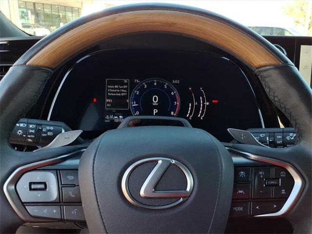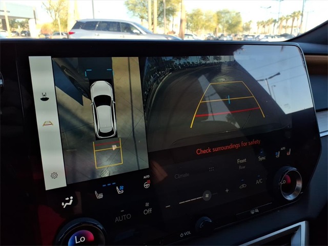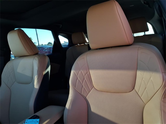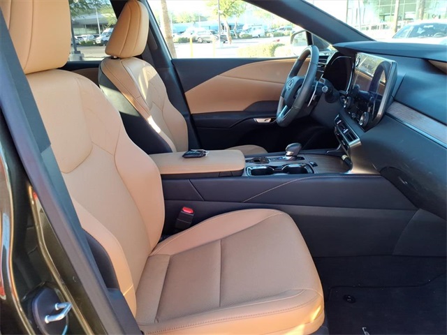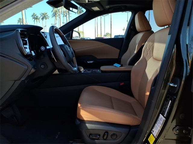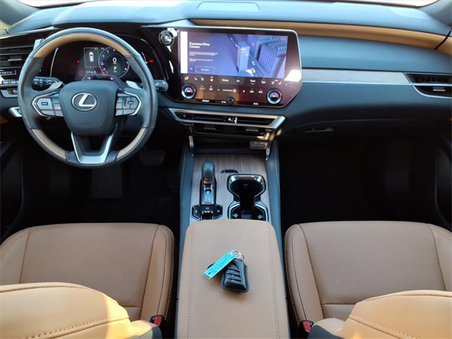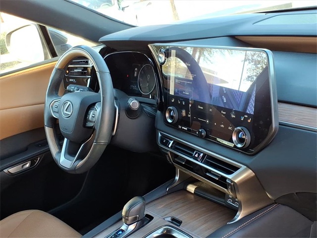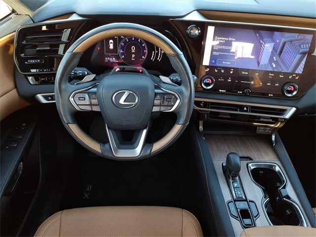 This Lexus RX is equipped with the following features: Accessory Package (Z1) (Cargo Net, Carpet Cargo Mat, and Key Gloves), Cold Area Package, Convenience Package (Electrochromic Heated Outside Rearview Mirror and Lane Change Assist w/Lane Keeping Assist System), Premium Package, Palomino W/Ash Bamboo Artificial Leather, 12 Speakers, 19" Wheels, 3.33 Axle Ratio, 4-Wheel Disc Brakes, 8-Way Power Driver & Front Passenger Seat Adjusters, ABS brakes, Air Conditioning, Alloy wheels, AM/FM radio: SiriusXM, Anti-whiplash front head restraints, Auto High-beam Headlights, Auto tilt-away steering wheel, Auto-dimming door mirrors, Auto-dimming Rear-View mirror, Automatic temperature control, Brake assist, Bumpers: body-color, Compass, Delay-off headlights, Driver door bin, Driver vanity mirror, Dual front impact airbags, Dual front side impact airbags, Electronic Stability Control, Emergency communication system: Safety Connect (10-year trial), Exterior Parking Camera Rear, Four wheel independent suspension, Front anti-roll bar, Front Bucket Seats, Front Center Armrest, Front dual zone A/C, Front fog lights, Front reading lights, Fully automatic headlights, Garage door transmitter: HomeLink, Genuine wood console insert, Heated & Ventilated Front Bucket Seats, Heated door mirrors, Heated front seats, Heated steering wheel, Illuminated entry, Leather Shift Knob, Leather steering wheel, Low tire pressure warning, Memory seat, Navigation System, NuLuxe Seat Trim, Occupant sensing airbag, Outside temperature display, Overhead airbag, Overhead console, Panic alarm, Passenger door bin, Passenger vanity mirror, Power door mirrors, Power driver seat, Power Liftgate, Power moonroof, Power passenger seat, Power Rear Door w/Kick Sensor, Power steering, Power windows, Quick Charging Cables-Mobile, Radio data system, Radio: Lexus Interface w/14" HD Touchscreen Display, Radio: Lexus Interface w/9.8" HD Touchscreen Display, Rain sensing wipers, Rear air conditioning, Rear anti-roll bar, Rear reading lights, Rear seat center armrest, Rear side impact airbag, Rear window defroster, Rear window wiper, Remote keyless entry, Security system, Speed control, Speed-sensing steering, Split folding rear seat, Spoiler, Steering wheel memory, Steering wheel mounted audio controls, Tachometer, Telescoping steering wheel, Tilt steering wheel, Traction control, Trip computer, Turn signal indicator mirrors, Variably intermittent wipers, Ventilated front seats, and Wireless Apple CarPlay/Wireless Android Auto.