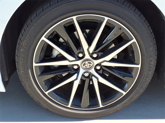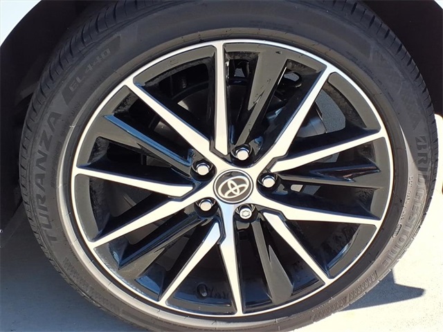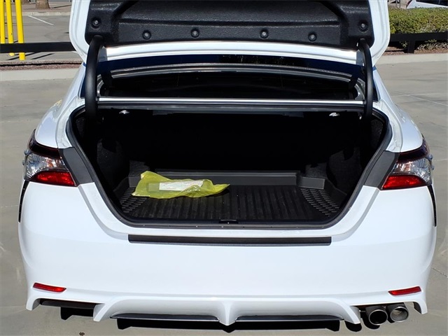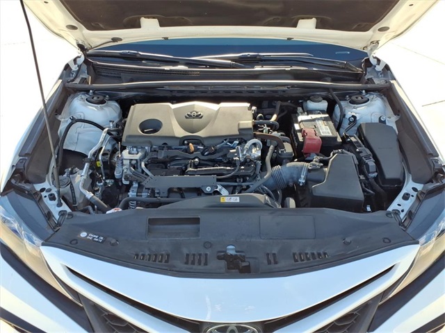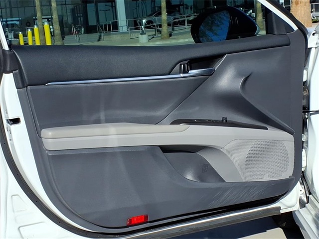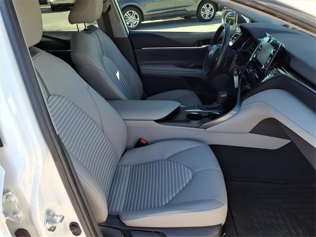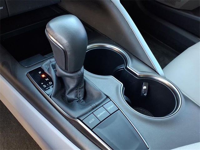 This Toyota Camry is equipped with the following features: Ash w/Sport SofTex Seat Trim w/Fabric Inserts, 18" x 8J Alloy Wheels, 4-Wheel Disc Brakes, 6 Speakers, ABS brakes, Air Conditioning, Alloy wheels, AM/FM radio: SiriusXM, Apple CarPlay/Android Auto, Auto High-beam Headlights, Automatic temperature control, Brake assist, Bumpers: body-color, Delay-off headlights, Driver door bin, Driver vanity mirror, Dual front impact airbags, Dual front side impact airbags, Electronic Stability Control, Emergency communication system: Safety Connect (1-year trial), Exterior Parking Camera Rear, Four wheel independent suspension, Front anti-roll bar, Front Bucket Seats, Front Center Armrest, Front dual zone A/C, Front reading lights, Fully automatic headlights, Heated door mirrors, Illuminated entry, Knee airbag, Leather steering wheel, Low tire pressure warning, Occupant sensing airbag, Outside temperature display, Overhead airbag, Overhead console, Panic alarm, Passenger door bin, Passenger vanity mirror, Power door mirrors, Power driver seat, Power steering, Power windows, Radio data system, Radio: Audio, Rear anti-roll bar, Rear seat center armrest, Rear side impact airbag, Rear window defroster, Remote keyless entry, Security system, Speed control, Speed-sensing steering, Split folding rear seat, Spoiler, Sport SofTex Seat Trim w/Fabric Inserts, Steering wheel mounted audio controls, Tachometer, Telescoping steering wheel, Tilt steering wheel, Traction control, Trip computer, Turn signal indicator mirrors, and Variably intermittent wipers.