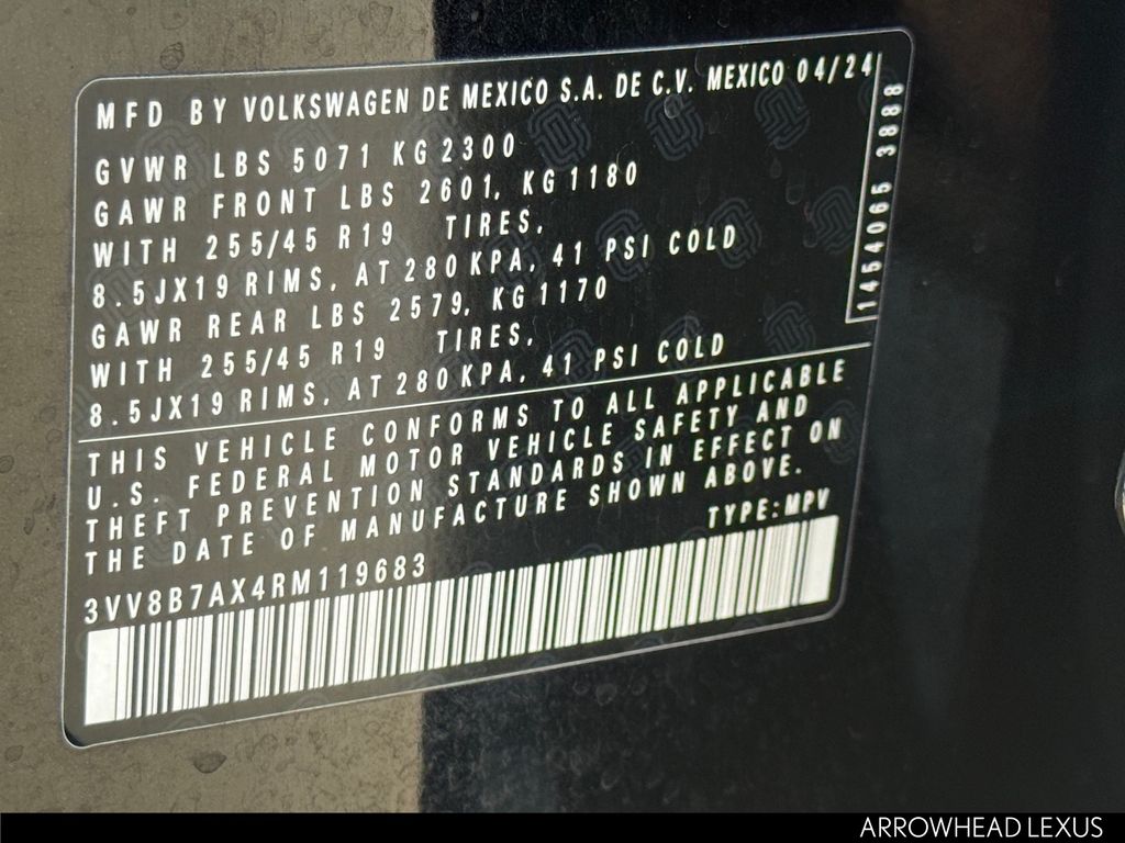 This Volkswagen Tiguan is equipped with the following features: AWD, 3.33 Axle Ratio, 4-Wheel Disc Brakes, 4-Wheel Independent Suspension, 6 Speakers, ABS brakes, Air Conditioning, Alloy wheels, AM/FM radio: SiriusXM with 360L, Auto-dimming Rear-View mirror, Automatic temperature control, Brake assist, Bumpers: body-color, Compass, Delay-off headlights, Driver door bin, Driver vanity mirror, Dual front impact airbags, Dual front side impact airbags, Electronic Stability Control, Emergency communication system: VW Car-Net Safe & Secure 5-year, Exterior Parking Camera Rear, Four wheel independent suspension, Front anti-roll bar, Front Bucket Seats, Front Center Armrest, Front dual zone A/C, Front reading lights, Fully automatic headlights, Heated door mirrors, Heated Front Seats, Heated front seats, Illuminated entry, Leather Shift Knob, Leather steering wheel, Low tire pressure warning, Occupant sensing airbag, Outside temperature display, Overhead airbag, Overhead console, Panic alarm, Passenger door bin, Passenger vanity mirror, Perforated V-Tex Leatherette Seating Surfaces, Power door mirrors, Power driver seat, Power Liftgate, Power moonroof, Power steering, Power windows, Radio data system, Radio: MIB3 Composition Media AM/FM/HD, Rain sensing wipers, Rear anti-roll bar, Rear reading lights, Rear seat center armrest, Rear window defroster, Rear window wiper, Remote keyless entry, Security system, Speed control, Speed-sensing steering, Split folding rear seat, Spoiler, Sport steering wheel, Steering wheel mounted audio controls, Tachometer, Telescoping steering wheel, Tilt steering wheel, Traction control, Trip computer, Turn signal indicator mirrors, Variably intermittent wipers, and Wheels: 19" Black Painted Twin 5-Spoke Alloy.